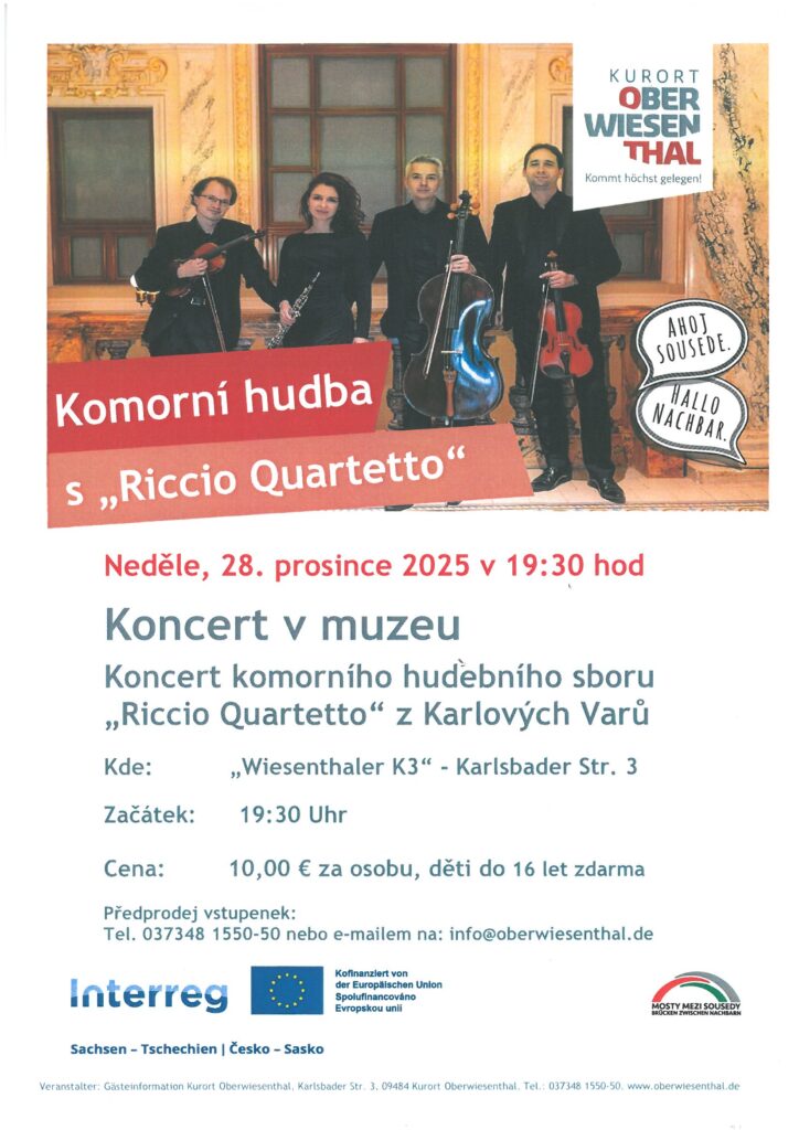 Zveme Vás na koncert komorního hudebního souboru „Riccio Quartetto“ z Karlových Varů, který se uskuteční 28.12.2025 v 19:30 v Kurort Oberwiesenthal.